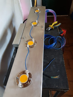 Ahora que ya tenemos todo montado tan sólo nos queda conectar. Esto es una conexión en serie, pondremos el primer cable en el negativo del que está más a la izquierda y luego conectaremos el que va a positivo, lo pasamos por atrás del disipador, volvemos a pasarlo al frente y lo conectamos al negativo del siguiente chip y repetimos la acción, ponemos otro cable al positivo del siguiente chip lo pasamos hacia atrás del disipador, lo volvemos a pasar para adelante y lo conectamos al negativo del siguiente chip. Hasta llegar al último. Así el cable que quedó más a la izquierda será el positivo y el más a la derecha el negativo. Estos los conectaremos al driver, le ponemos al driver un cable con enchufe en la entrada de 220v y listo el pollo. Tenemos una lampara de led. Armada y funcional. Así es como terminamos Armando un LED CREE.